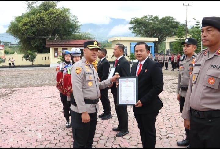Gayo Lues — Kapolres Gayo Lues AKBP Hyrowo, S.I.K., memimpin upacara penyerahan penghargaan kepada personel Polres Gayo Lues yang dinilai menunjukkan dedikasi tinggi dalam penanganan bencana hidrometeorologi di wilayah Kabupaten Gayo Lues, Senin (16/2/2026).